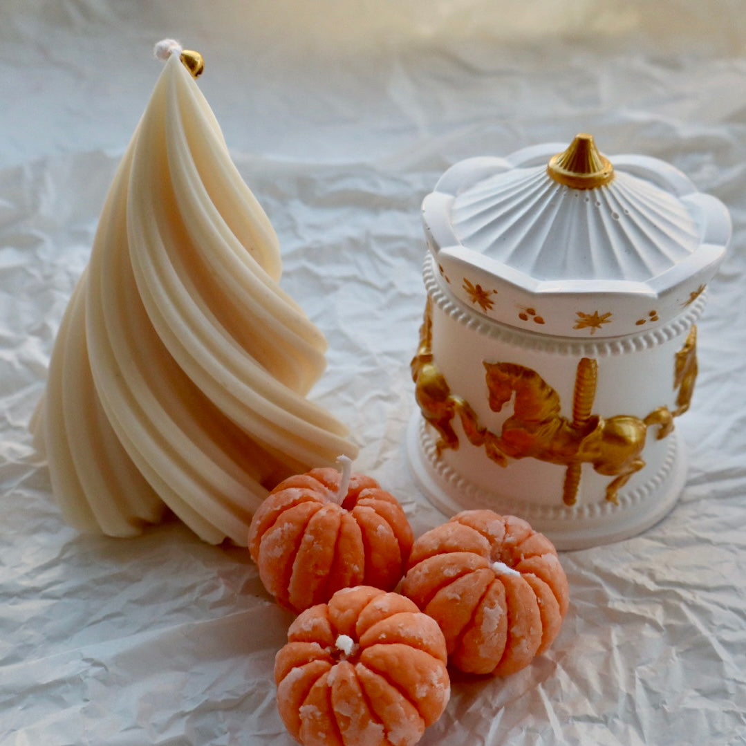 Las velas están hechas con 100% cera de soya. El árbol grande es sin aroma, mientras que la vela Carrusel y las velas mandarinas se pueden personalizar con el aroma de tu elección. ♥️