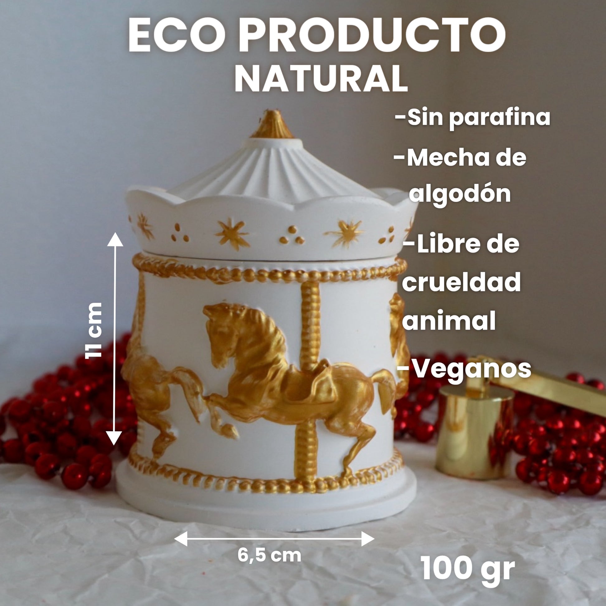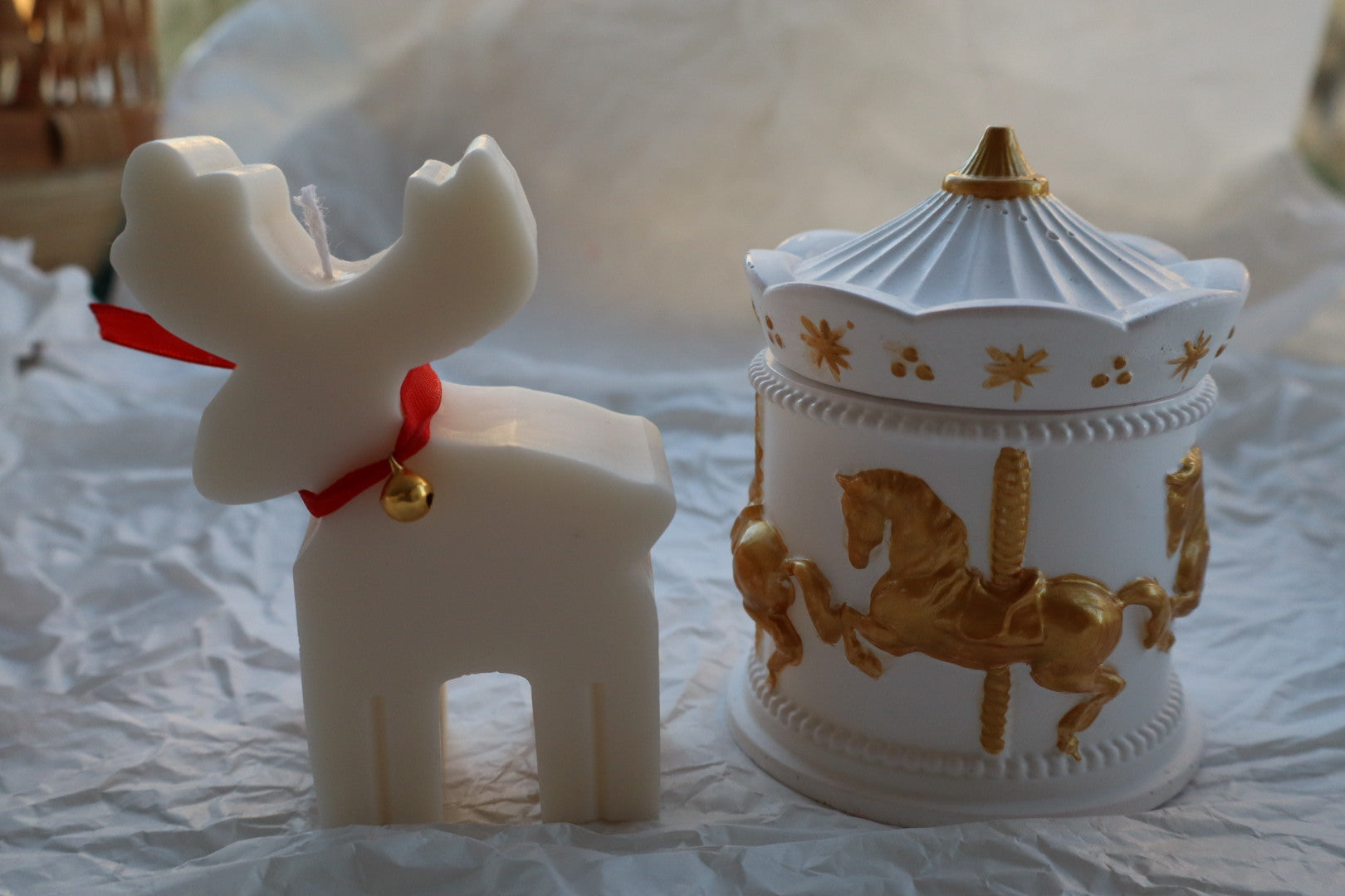 Las velas están hechas con 100% cera de soya. El reno es sin aroma, mientras que la vela Carrusel se puede personalizar con el aroma de tu elección. ♥️
