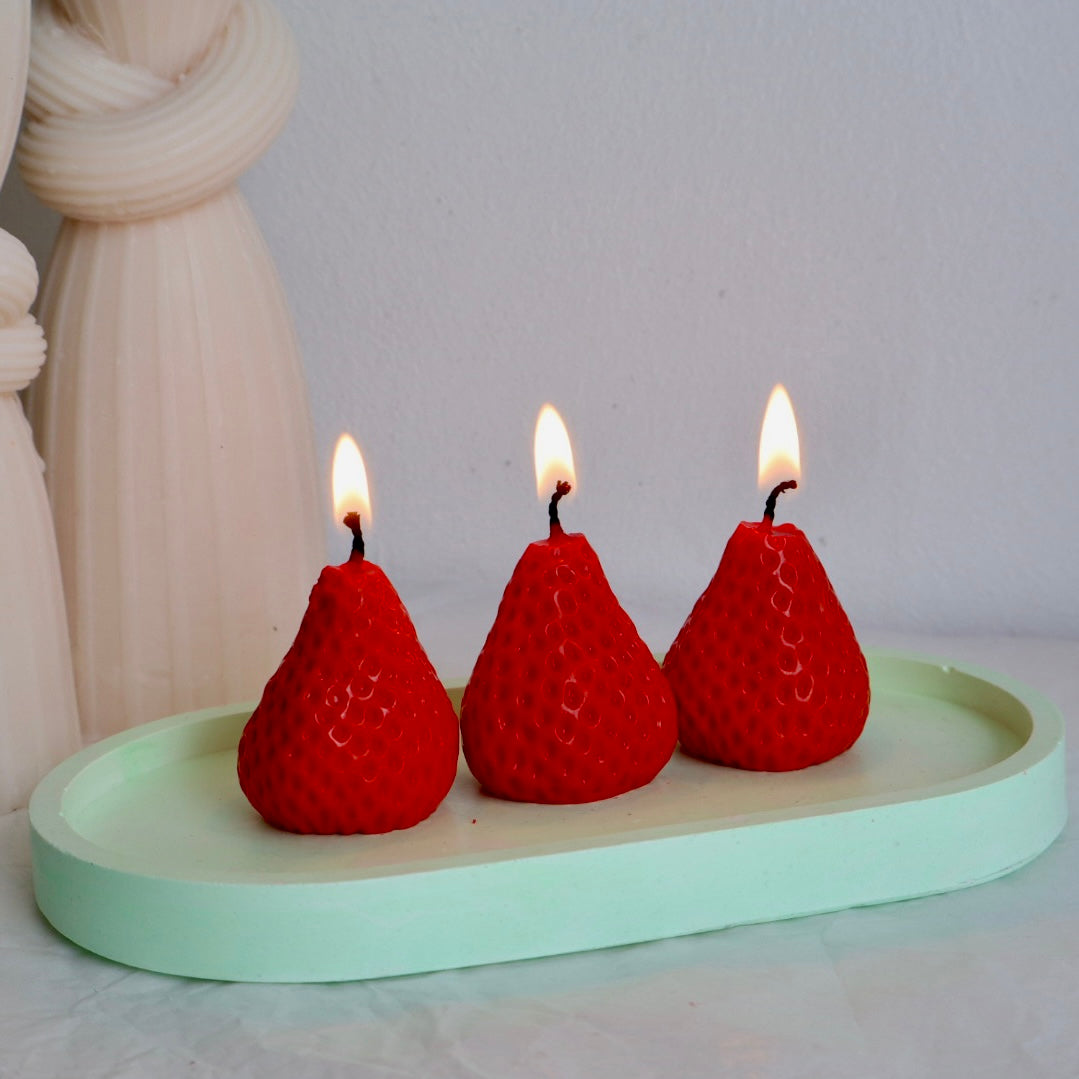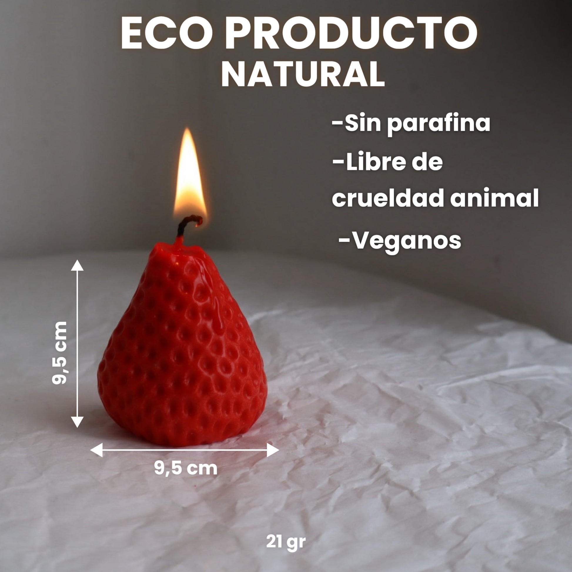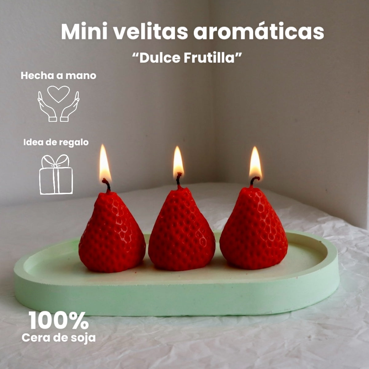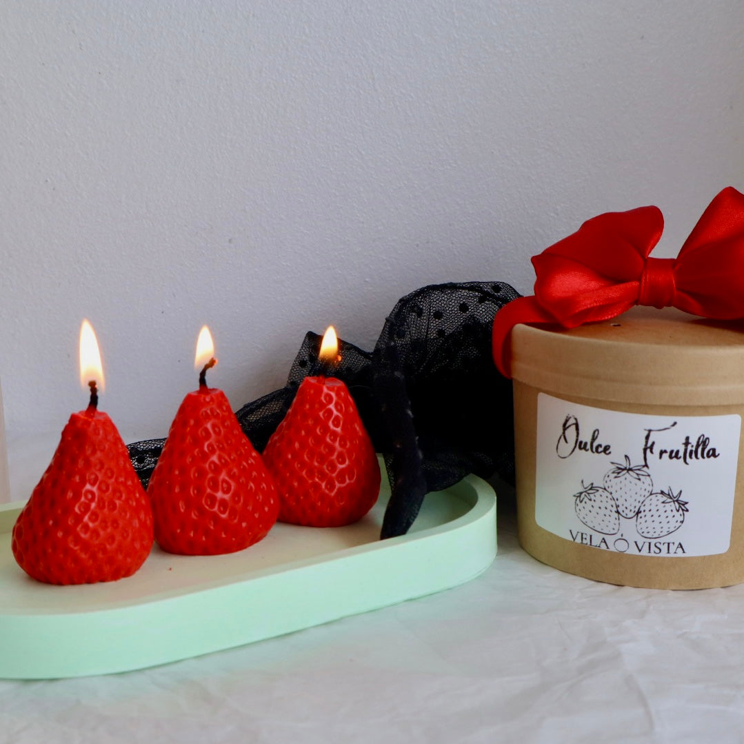 Tres pequeñas velas en forma de frutilla hechas a mano con cera 100% de soja 63 gr.Con un dulce y jugoso aroma a frutos rojos y frutilla fresca, estas velitas llenan tus espacios de alegría y frescura.