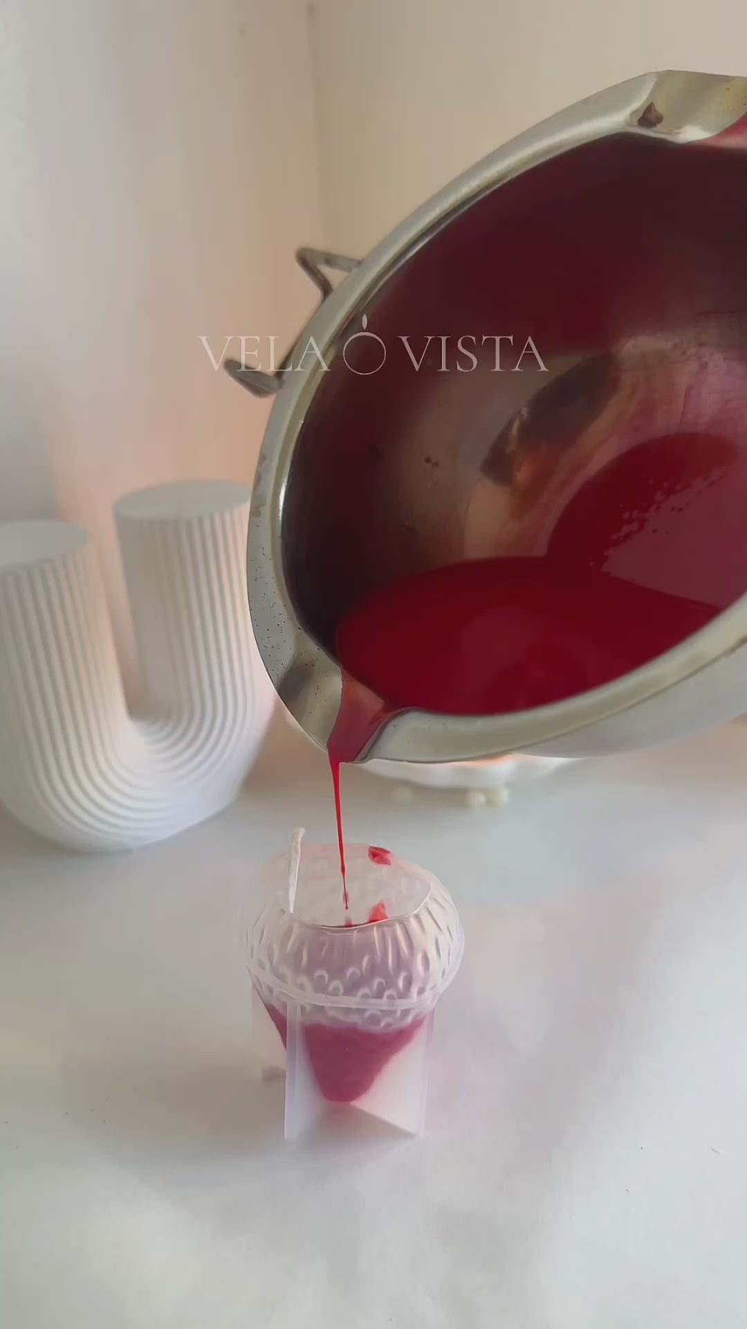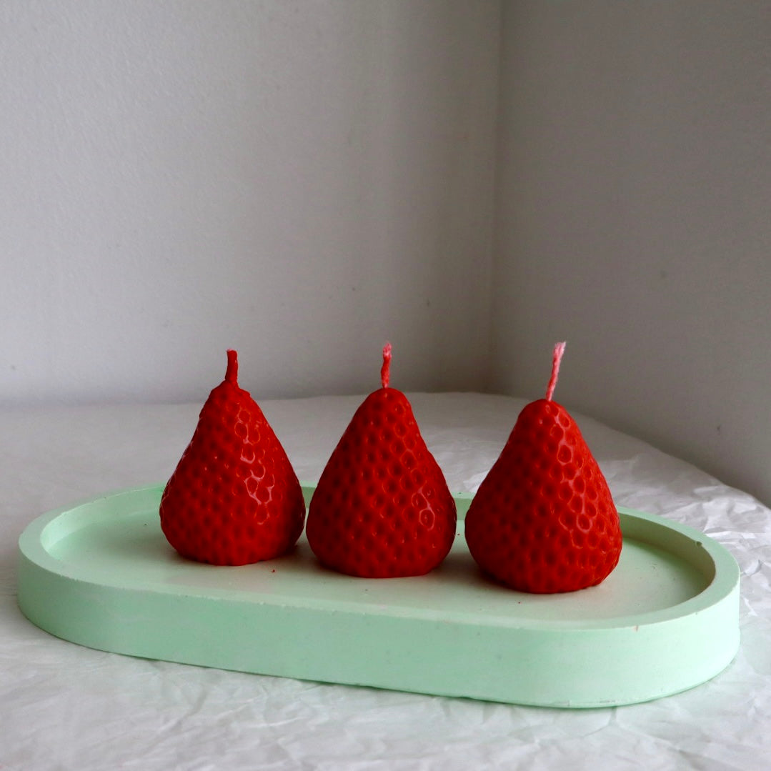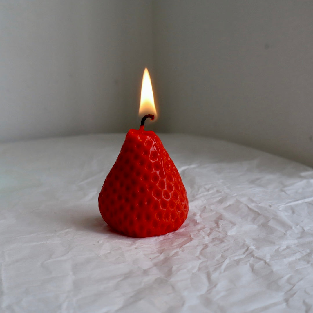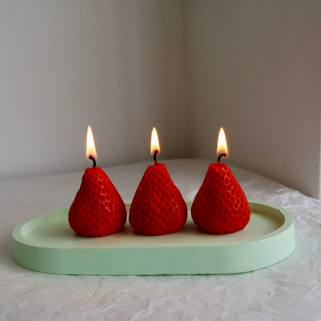 Tres pequeñas velas en forma de frutilla hechas a mano con cera 100% de soja 63 gr.Con un dulce y jugoso aroma a frutos rojos y frutilla fresca, estas velitas llenan tus espacios de alegría y frescura.