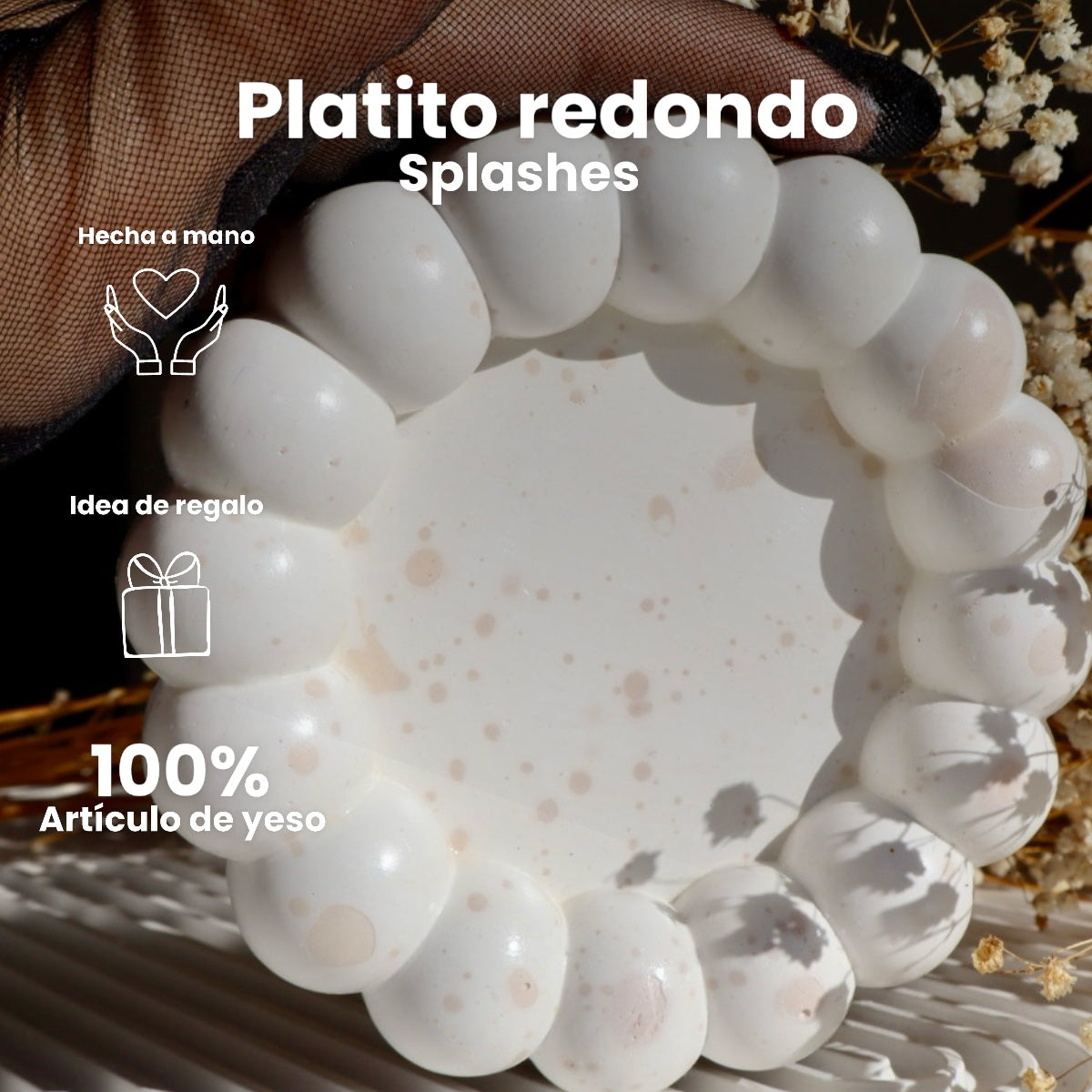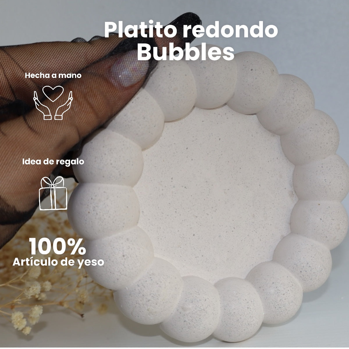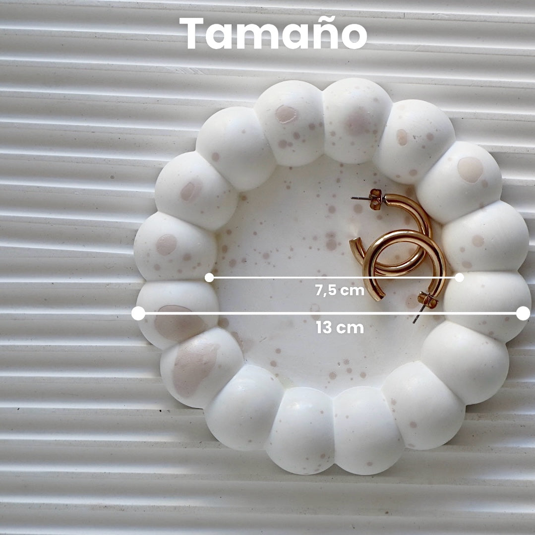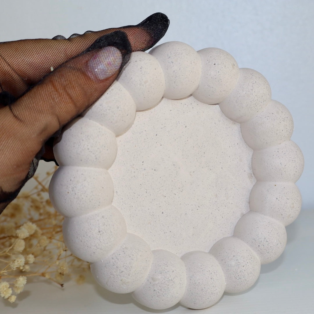 Un accesorio único hecho a mano en 100% yeso artesanal, con forma redonda y borde en relieve que imita burbujas suaves. Su diseño moderno y lúdico lo convierte en una pieza decorativa funcional y elegante para cualquier rincón de tu hogar.