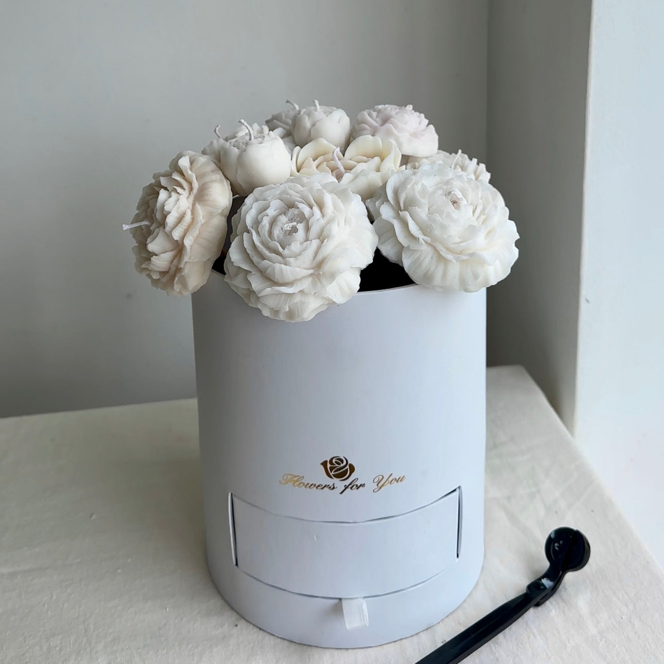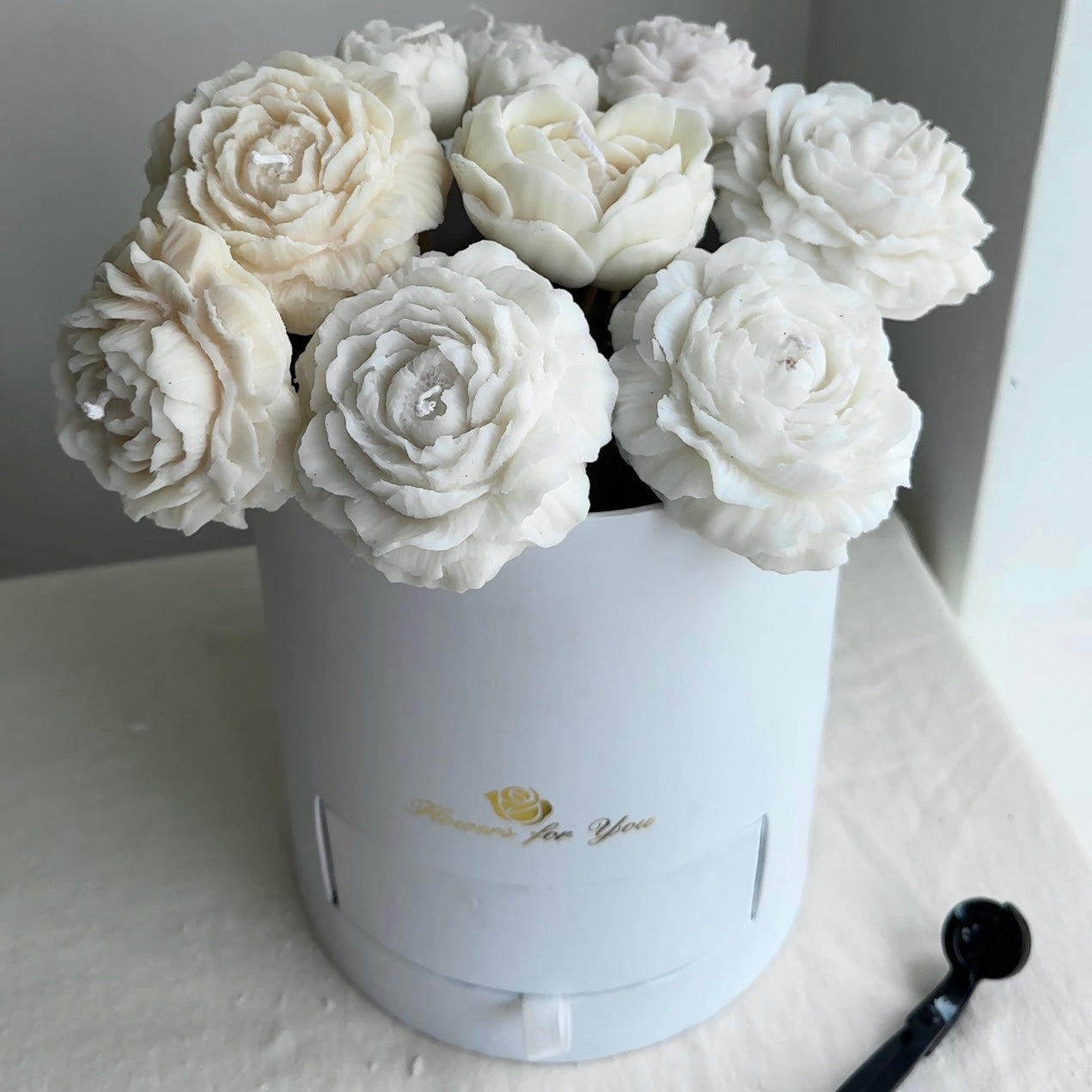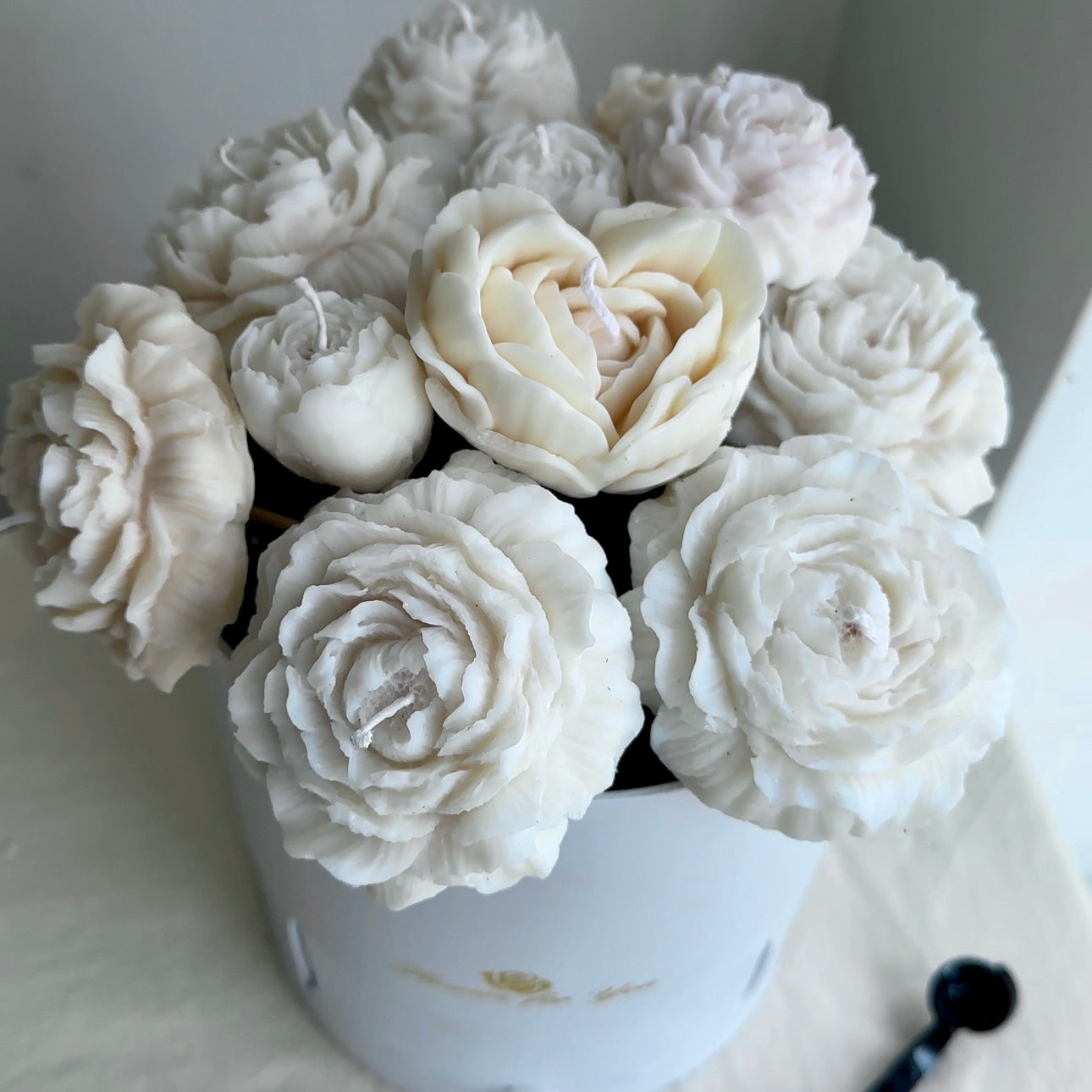 Un ramo delicado y sofisticado compuesto por velas artesanales en forma de peonías, hechas a mano con cera vegetal. Cada flor es única y está diseñada para decorar y aromatizar tus espacios con elegancia.
