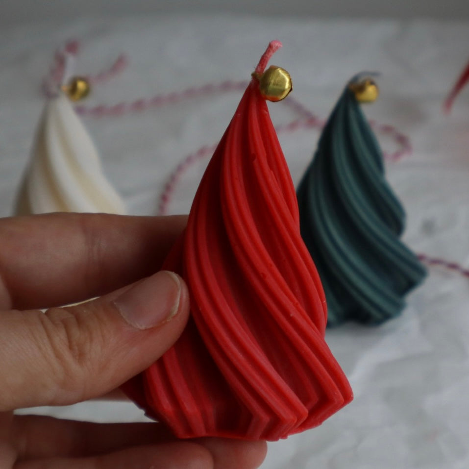 Tres pequeños pinos en un set: rojo, verde y blanco, ideal para un regalo de Navidad