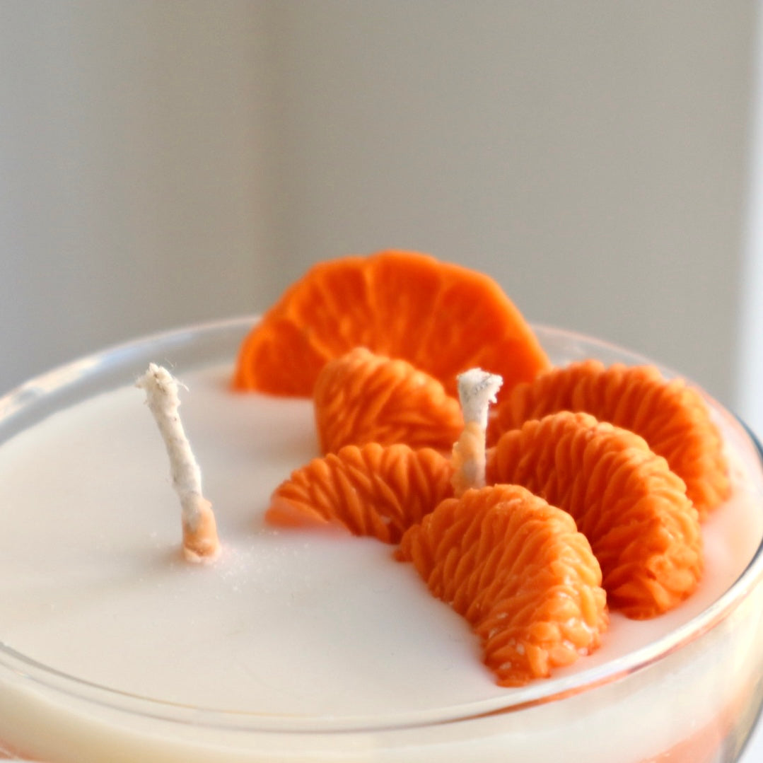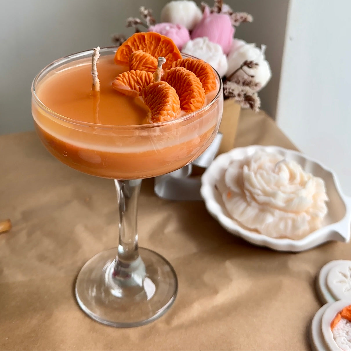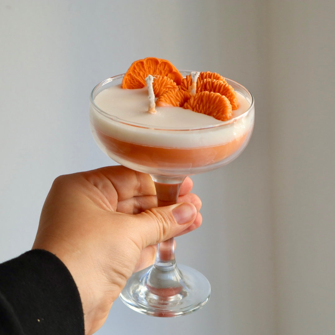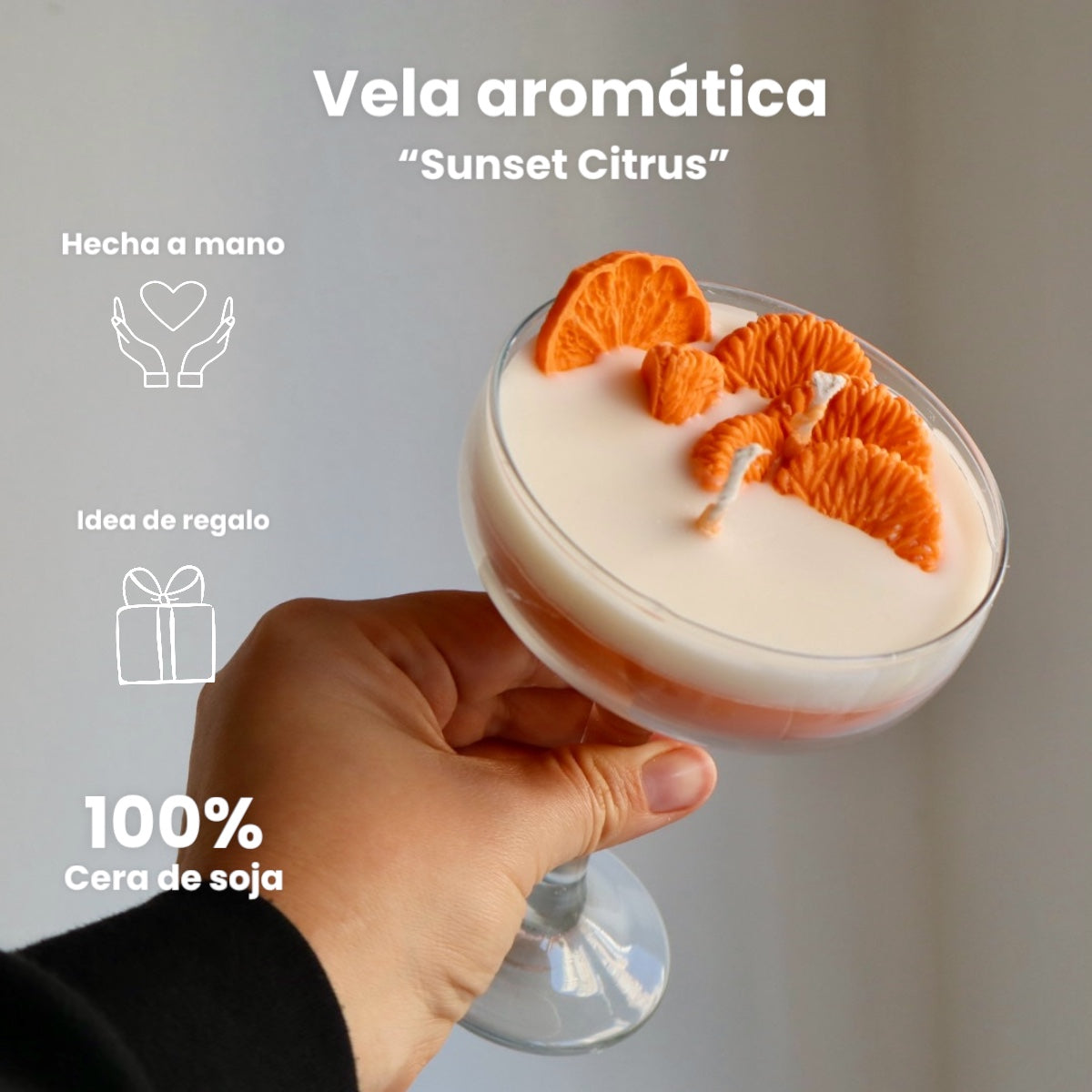 “Sunset Citrus” es una vela hecha a mano con 100% cera de soja natural, decorada con gajitos de mandarina elaborados en cera aromática. Viene en un vaso estilo cóctel que puedes reutilizar después.