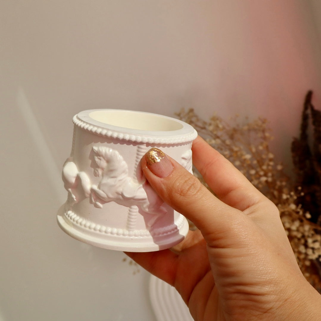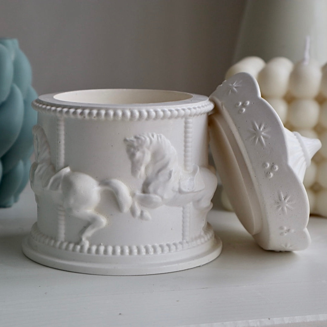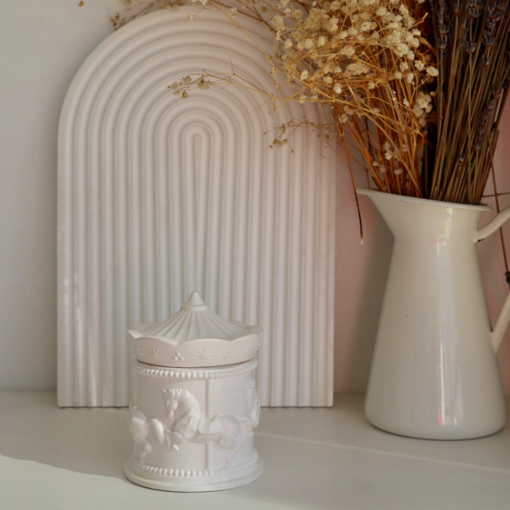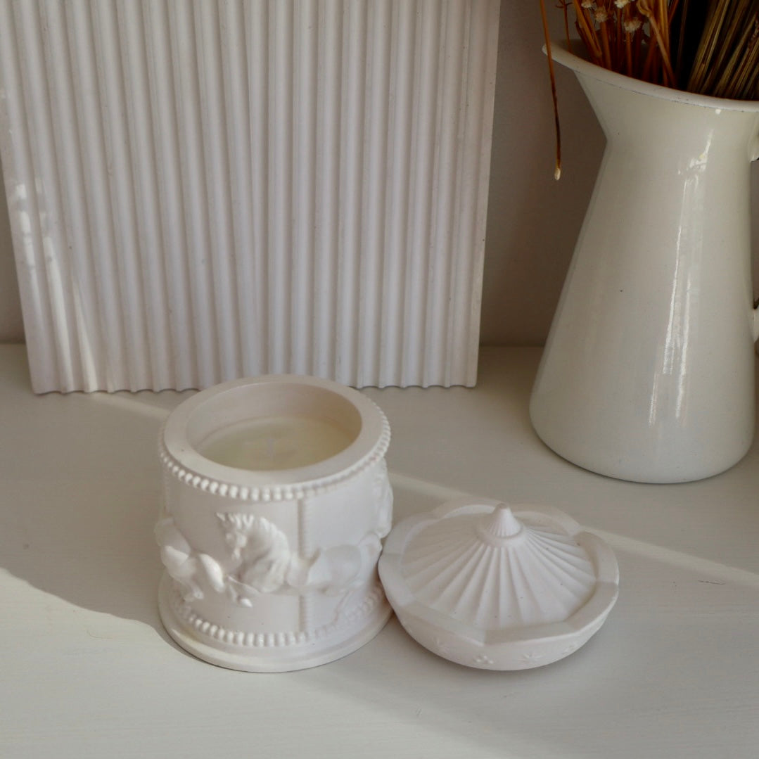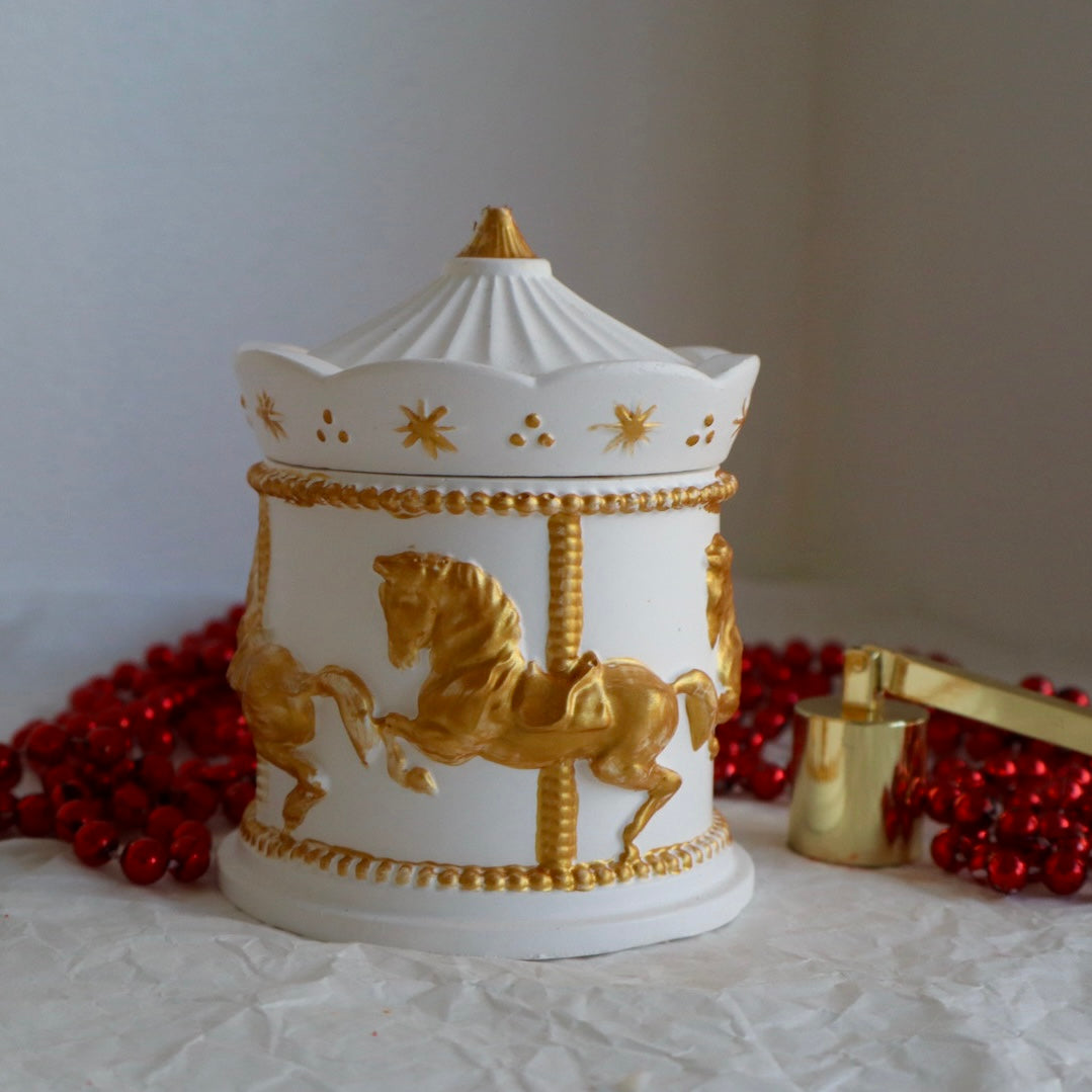 La vela y el vaso están inspirados en un carrusel clásico, y cada pieza ha sido cuidadosamente hecha a mano con cera de soja 100% natural.