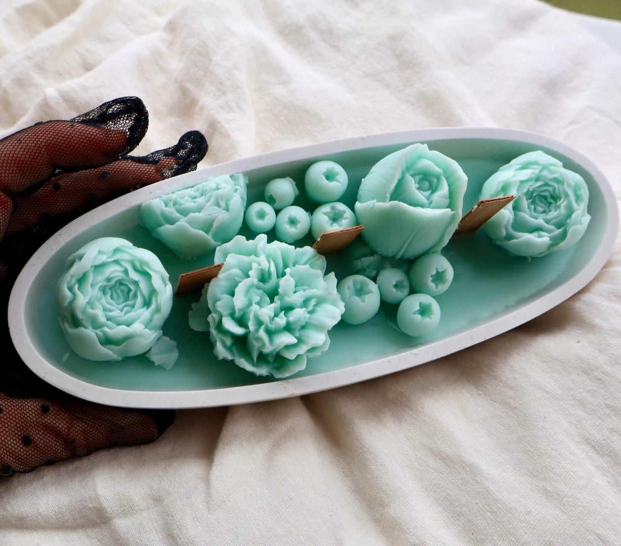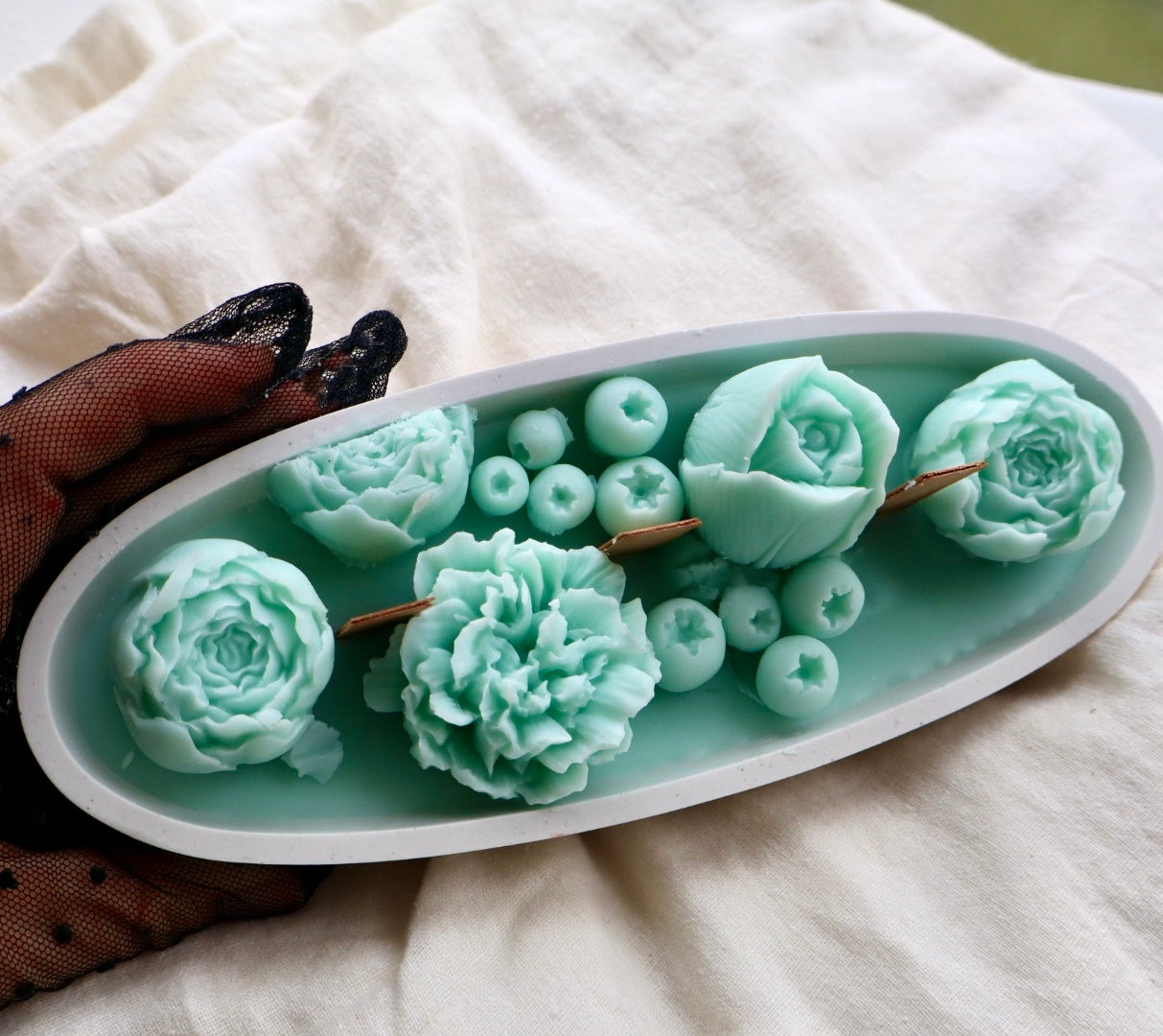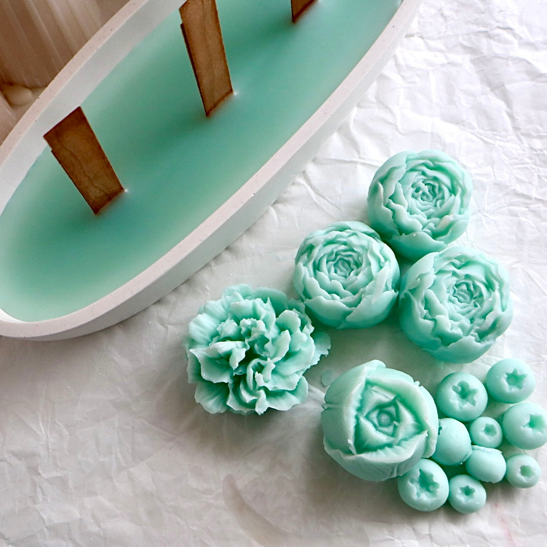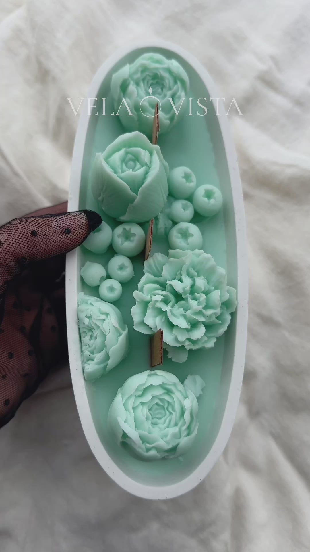 Con detalles florales en tonos verde agua, esta pieza combina la delicadeza de peonías, claveles y frutos con el suave crepitar de mechas de madera.