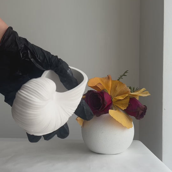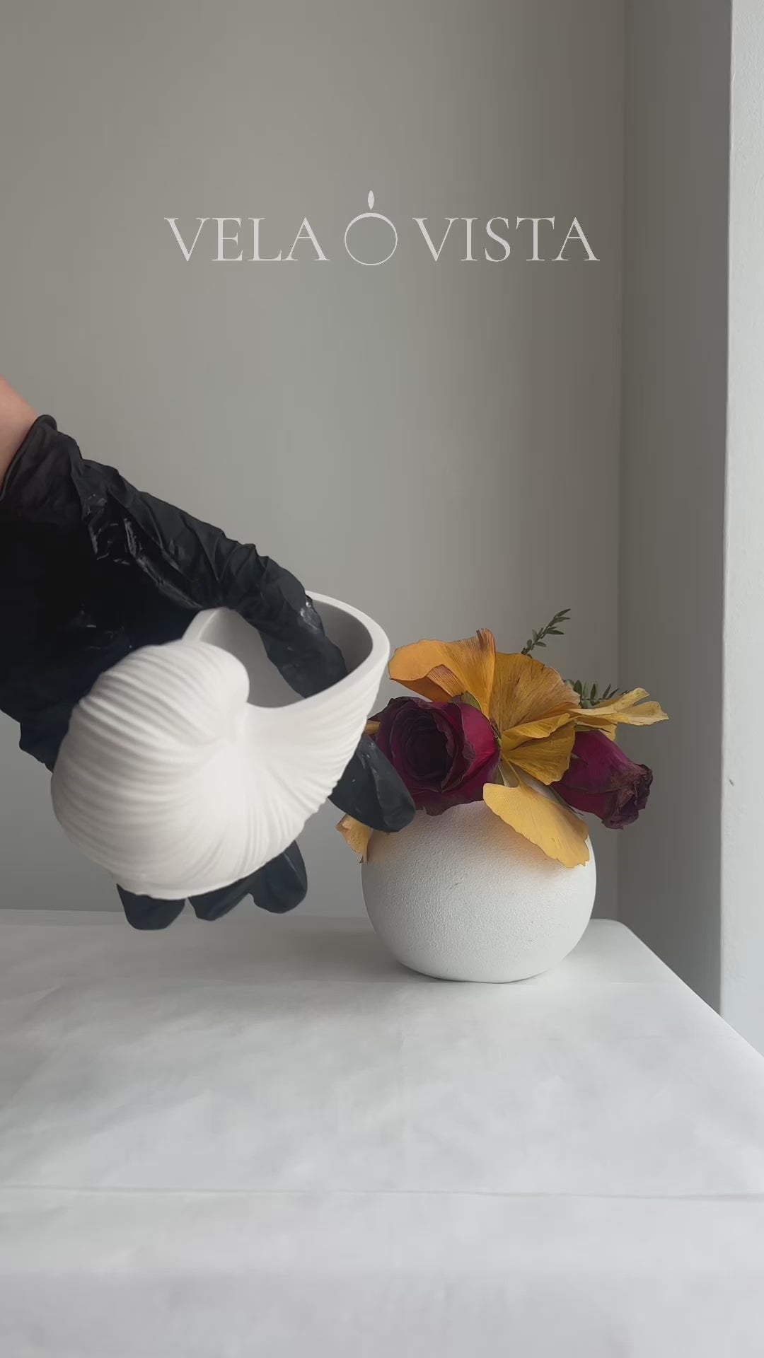 Vela aromática en forma de concha disponible en dos colores: blanca y perlada. Está hecha con 100% cera de soja natural y mecha de algodón.