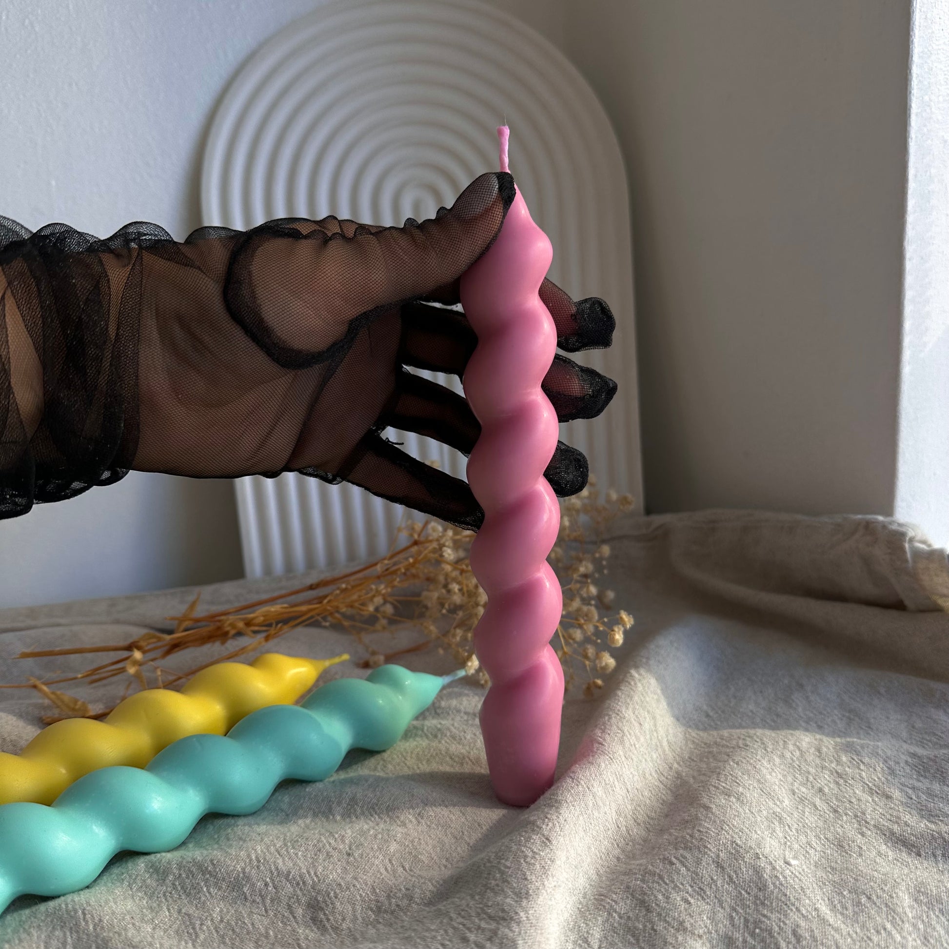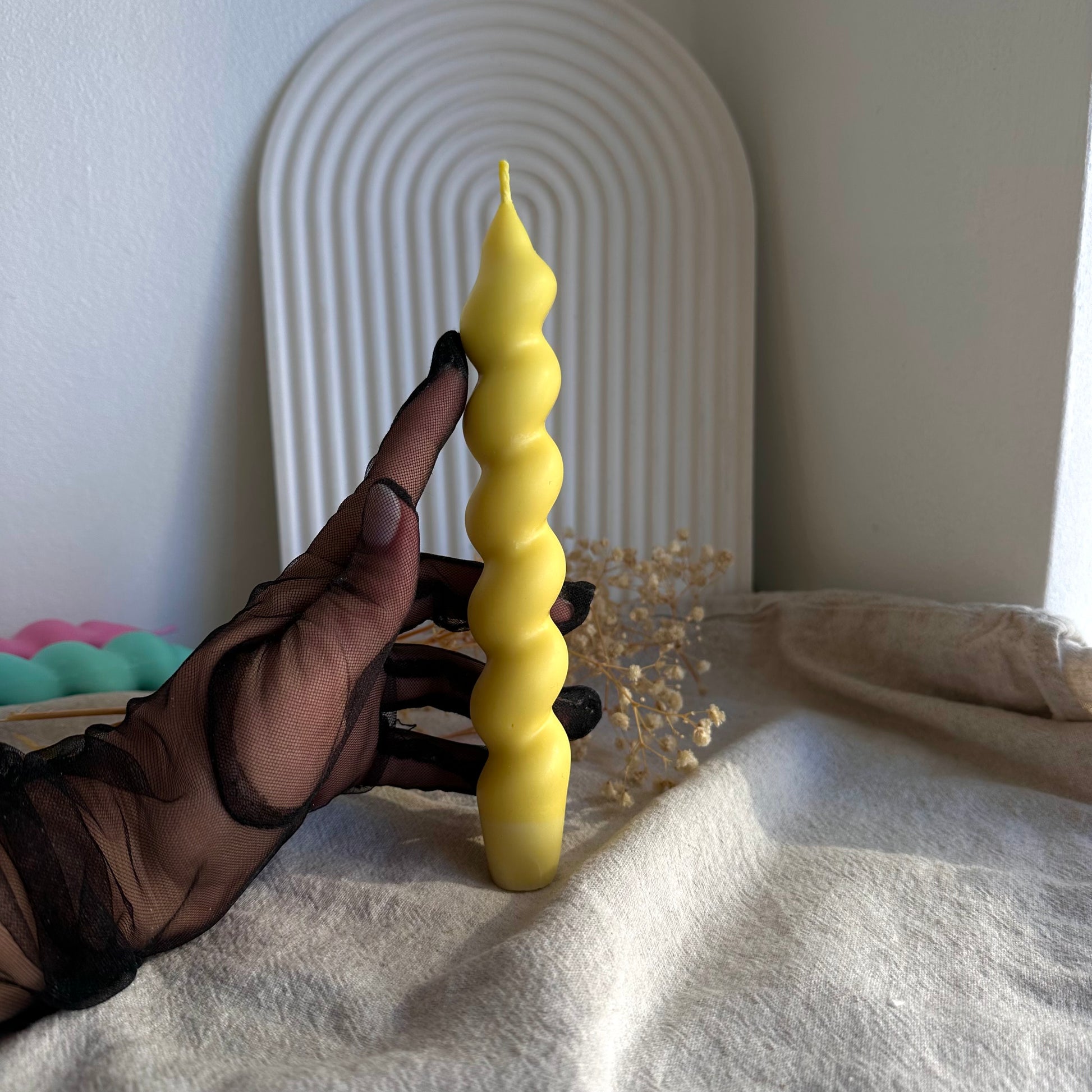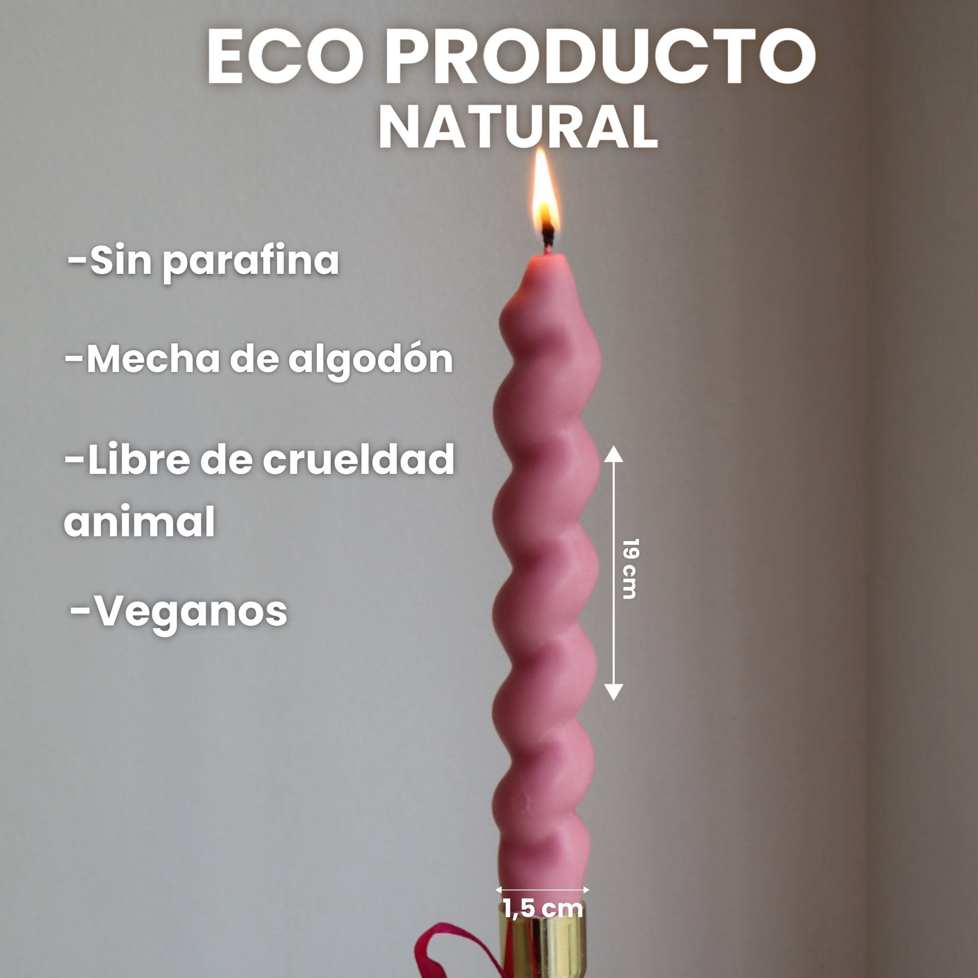 Elegancia y estilo en una vela delgada con forma espiral, hecha 100% a mano con cera de soja natural. Diseñada especialmente para candelabros, esta vela no solo ilumina, sino también decora cualquier espacio con un aire moderno y sofisticado.