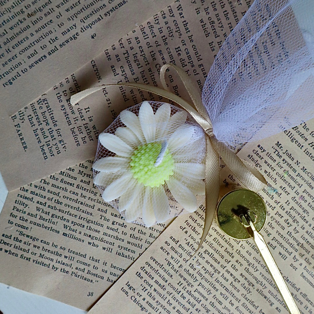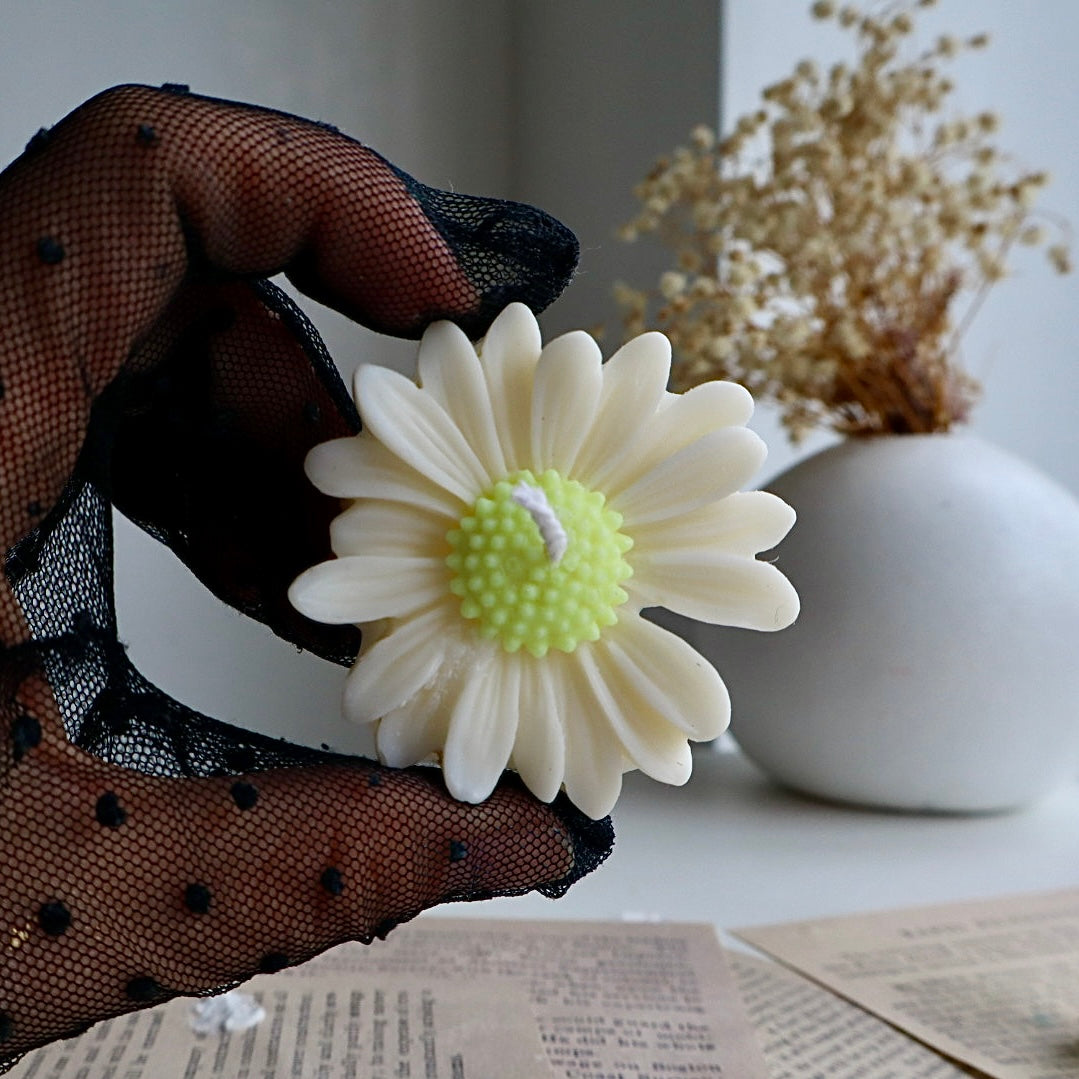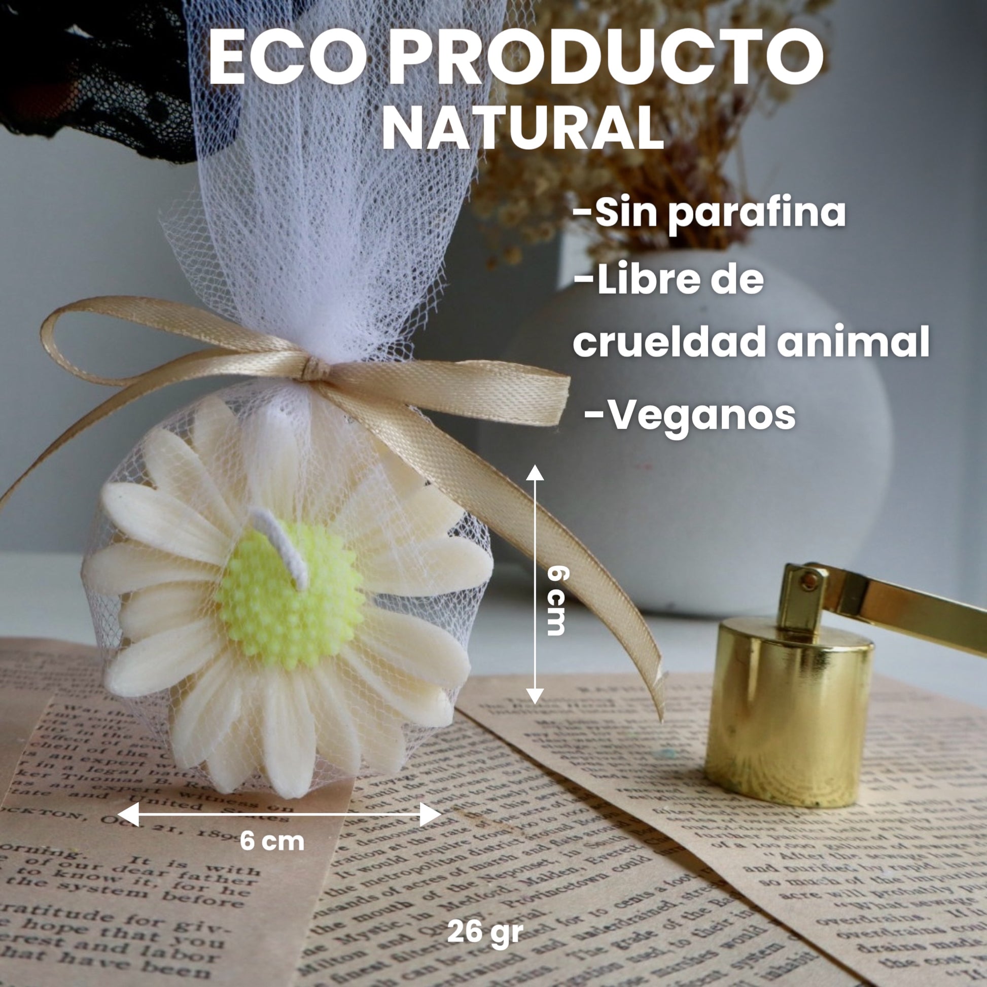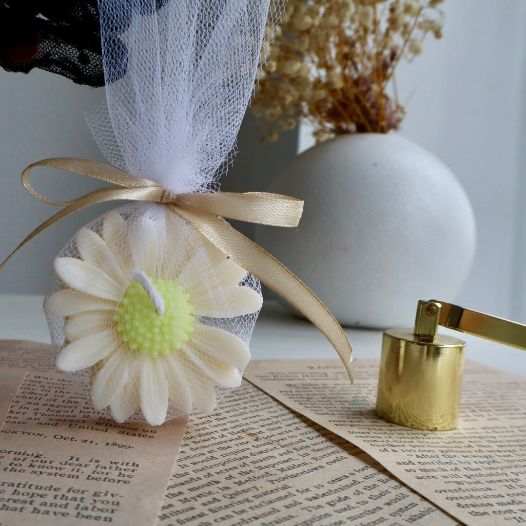 Hecha a mano con cera de soya 100% y diseñada en forma de margarita, esta velita es el recuerdo perfecto para agradecer a tus invitados con un toque de cariño y estilo.